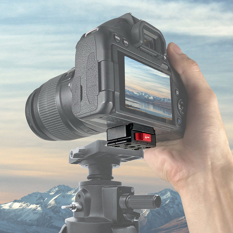 Ce système compact et innovant vous permet de monter facilement votre appareil photo sur tout type d'équipement de support, notamment des trépieds, des monopodes, des stabilisateurs, des curseurs, etc. Avec sa conception anti-balancement, notre plaque offre une stabilité inégalée d'une simple pression. Dites adieu aux photos tremblantes pour toujours !