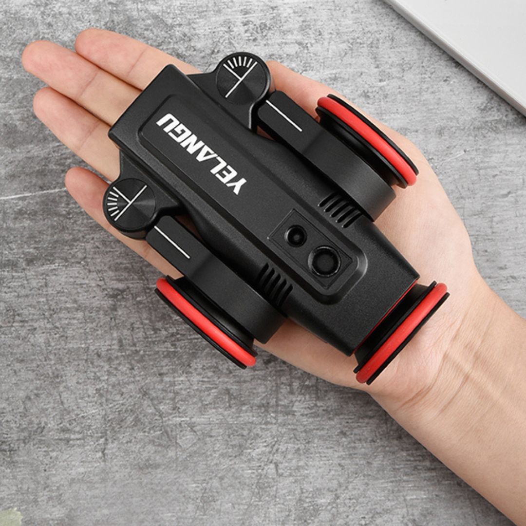Le Chariot motorisé pour reflex numérique L4X depuis YELANGU, en noir avec des accents orange, fonctionne sur une surface plane et peut effectuer des mouvements droits, courbes ou circulaires à 360°. Ce chariot est conçu pour fonctionner avec des appareils photo reflex numériques et sans miroir pesant jusqu'à 6,6 livres//3 kg. Il comprend des supports filetés réversibles de 1/4"-20 à 3/8"-16 pour votre appareil photo ou votre rotule et peut prendre en charge les smartphones avec un disponible séparément. Pince pour smartphone. Les fonctionnalités du Dolly comprennent trois vitesses sélectionnables, un contrôle direct et une télécommande incluse avec une portée allant jusqu'à 19'.