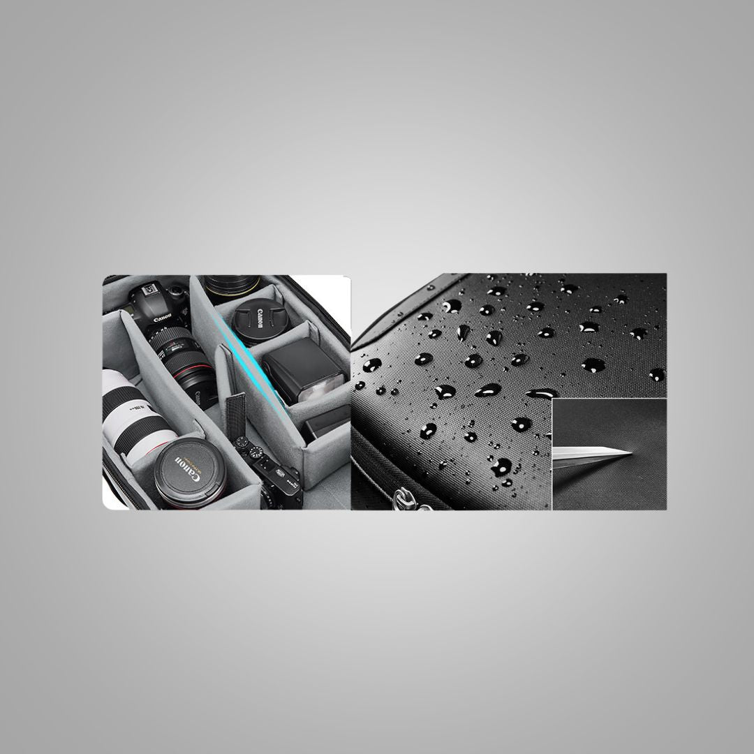 Le matériau externe de ce sac à dos est hydrofuge, et sa construction de rembourrage épaissie et son coussinet inférieur en caoutchouc antidérapant fonctionnent tous ensemble pour fournir une protection complète à votre équipement photographique coûteux. Et lors de longs voyages, vous pouvez faire confiance à ses doubles bretelles en éponge respirante pour relâcher la pression et vous garder à l'aise.